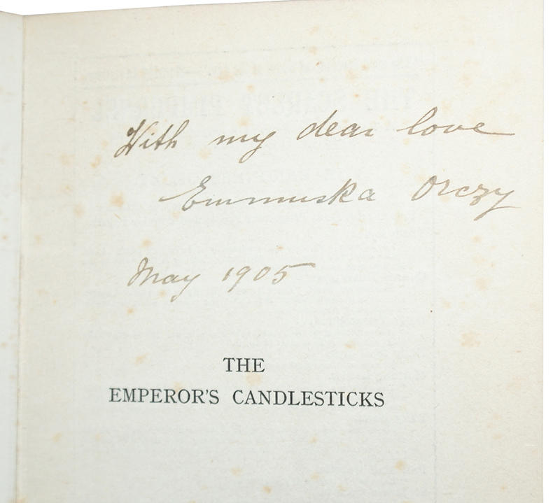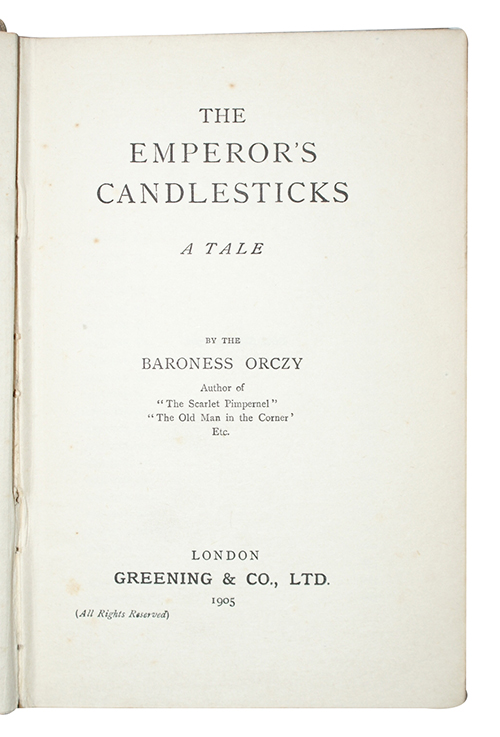 Baroness Orczy (1865-1947), Hungarian-born British novelist and playwright, most fondly remembered for her adventure series centred around the protagonist of The Scarlet Pimpernel. The Emperor's Candlesticks was Orczy's first work as an author rather than translator. First published in 1899 the novel was a commercial failure, only gaining popularity following Orczy's subsequent success with other titles. The story tells of the kidnapping of a Russian prince by anarchists and the ensuing actions of two spies in aiding and foiling the plot respectively.