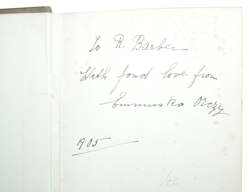 288pp. With half-title. Original publisher's cloth, lettered in gilt and black with device in black to upper board. Rubbed, slight loss to sunned spine. Leaves lightly toned/foxed. Presentation copy, inscribed in ink to recto of FFEP: 'To R. Barber with fond love from Emmuska Orczy, 1905' and again to half-title, 'With my dear love Emmuska Orczy, May 1905'.