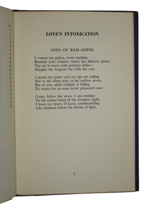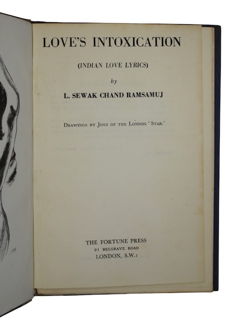 The sole edition of an illustrated volume of love poems by young Fiji-Indian poet Leonard Sewak Chand Ramsamuj, whose short but positively-received poetic career began with the publication of his previous work, Music of Life: A Collection of Poems (1950). The short contemporary review tipped-in to the front free endpaper declares boldly that 'Mr Ramsamuj's contribution at so early an age assures him a place in Indian literature'.